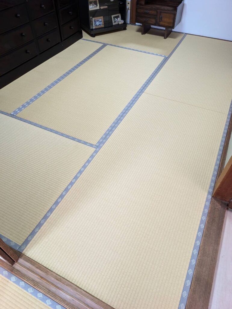 中国産糸引き畳→ダイケン健康畳.黄金白色へ畳の表替えをさせて頂きました。